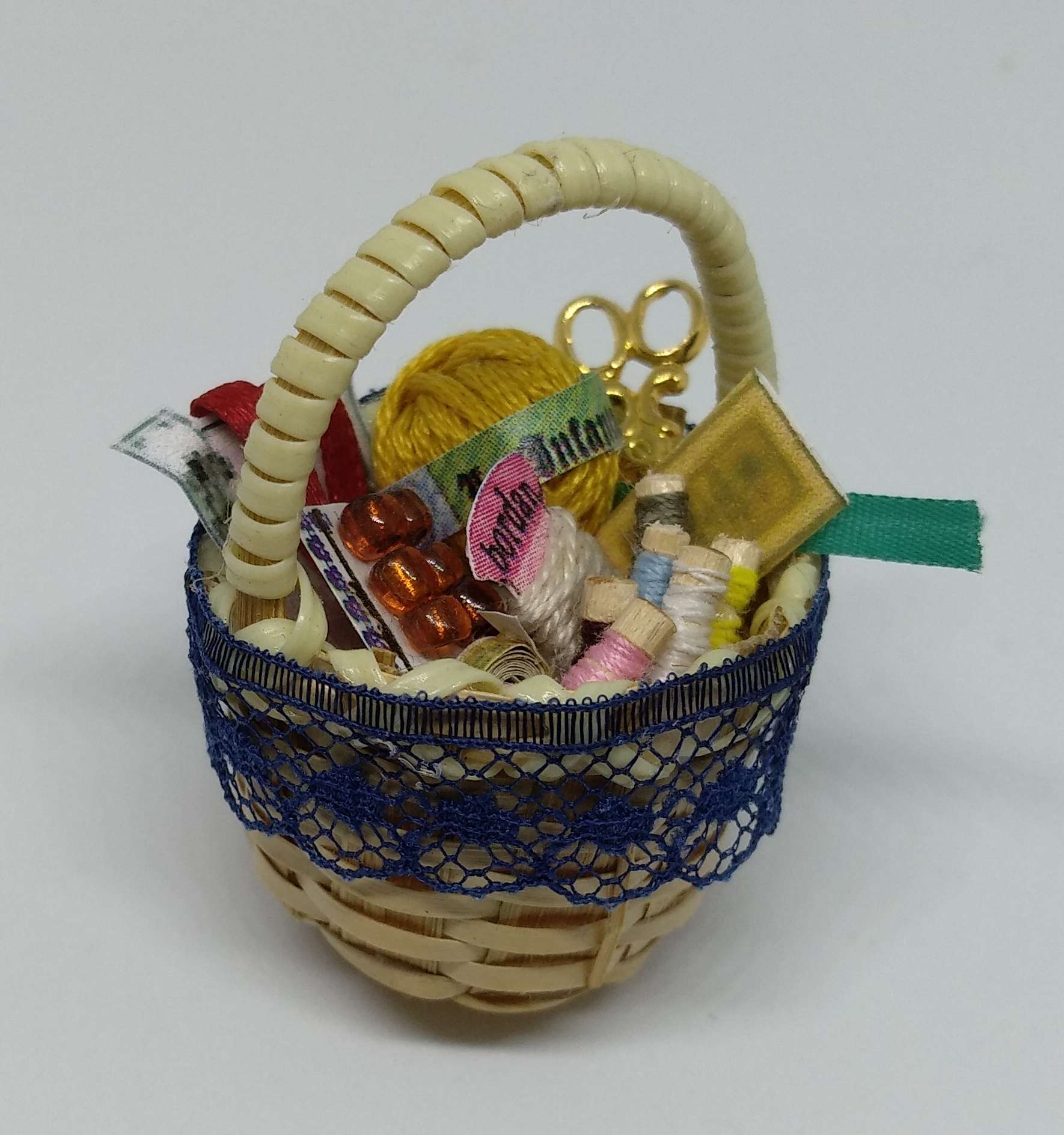 Cesta costurero, repleto de detalles de costura, tijeras, ovillos, dedal, hilos, encaje, botones, metro, cinta de seda…. Escala 1:12